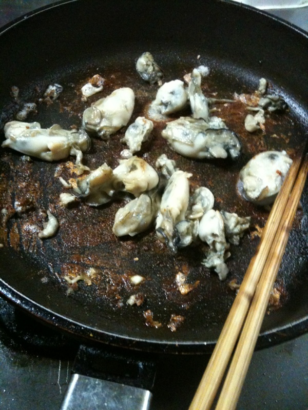 よくフライパンを加熱してから水を切ったカキを放り込む