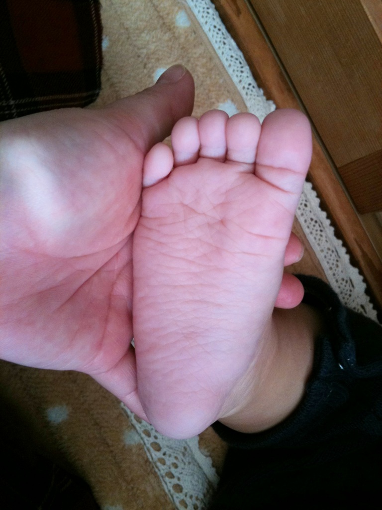 次男くんはまだ歩かないので、ちょコの近くで転がっているんだけど、なんて小ちゃい足なんだぁ~
