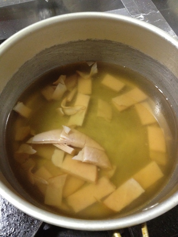 コンソメ1個を300ccのお湯に入れて、ハムを切って入れる~