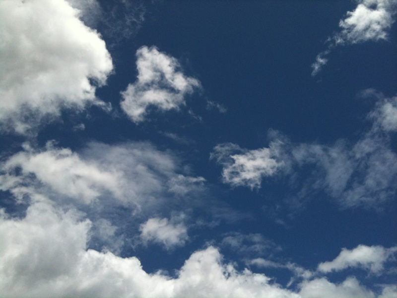 すっごく晴れてる空に、白い雲と灰色した雲が入りまじってて~