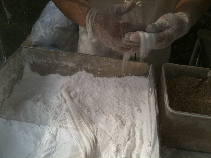 実演販売中で実際に作ってるとこを見ていたんだけど、手延べそうめんと同じような感じで…