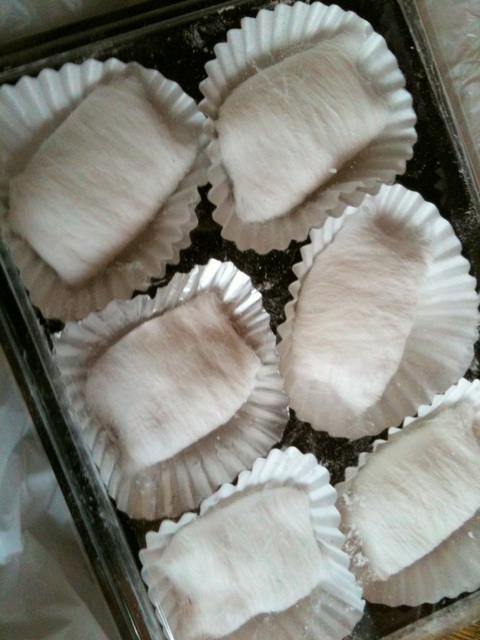 この「妖怪けうけげん」みたいなヒゲの束を短くちぎって、水あめ絡めたようなナッツ類を核にして巻き上げて完成!!