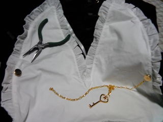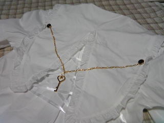 襟にはキーのアクセサリーが付いてて…