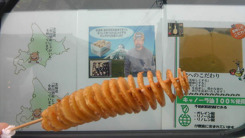 さて、ラジオは火曜日で目の前の五平もち屋さんは定休日で、いつも買えないんだけど、今日はラジオ局を出たとこで螺旋状に繋がったポテトの串焼き屋台が来てましたした(☆_☆)